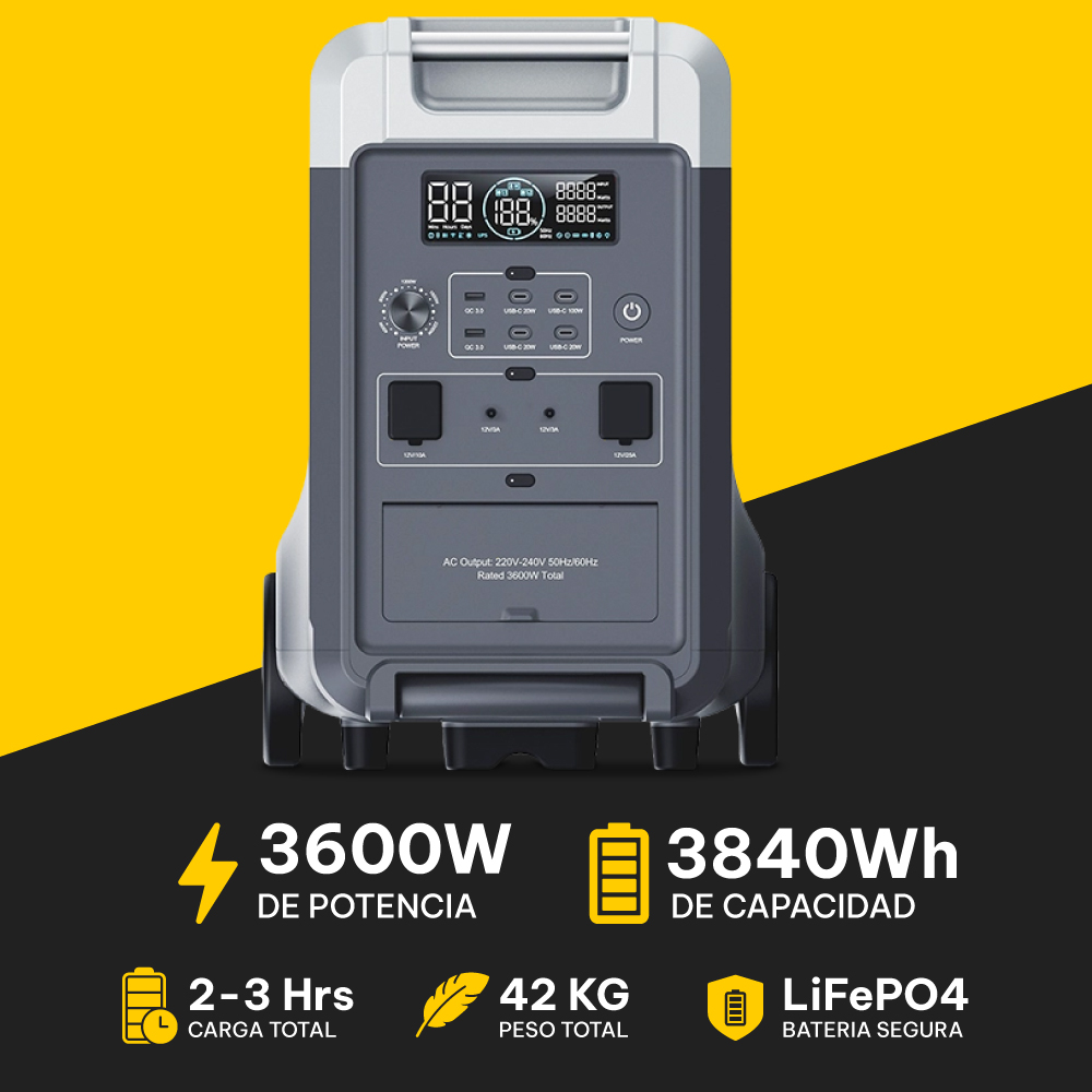 Incorpora una batería LiFePO₄ de 3840 Wh, reconocida por ser segura, estable ante variaciones térmicas y con una vida útil destacada, soportando miles de ciclos de carga con rendimiento confiable a largo plazo.
