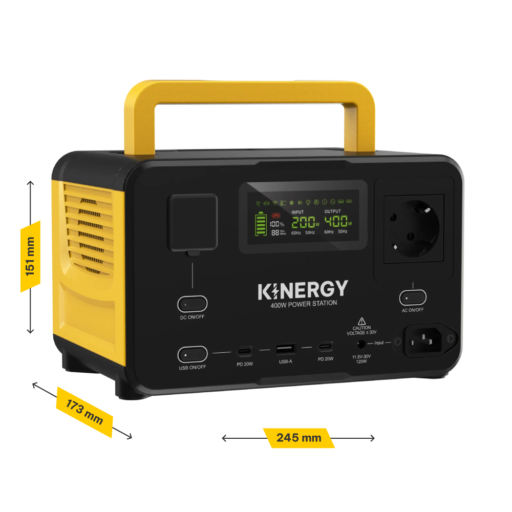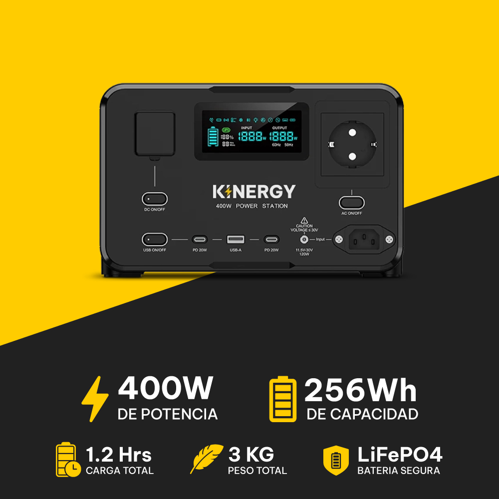 La Kinergy 400W ofrece energía confiable para tus dispositivos esenciales, ya sea en casa, al aire libre o durante un corte de luz.